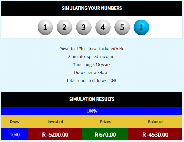 Over 10 years, your total spend would have reached around R5,200. But the outcome is far less exciting than you might expect: the simulation shows just R670 in winnings – leaving you with a net loss of R4,530.